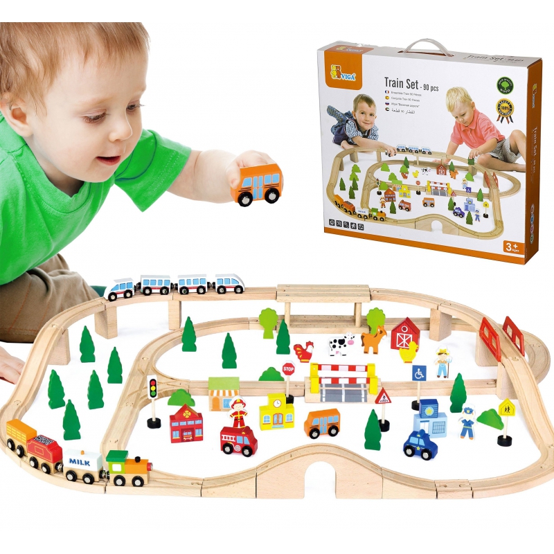 Medinis traukinys su traukinių takeliu vaikams 90 elementų Viga Toys