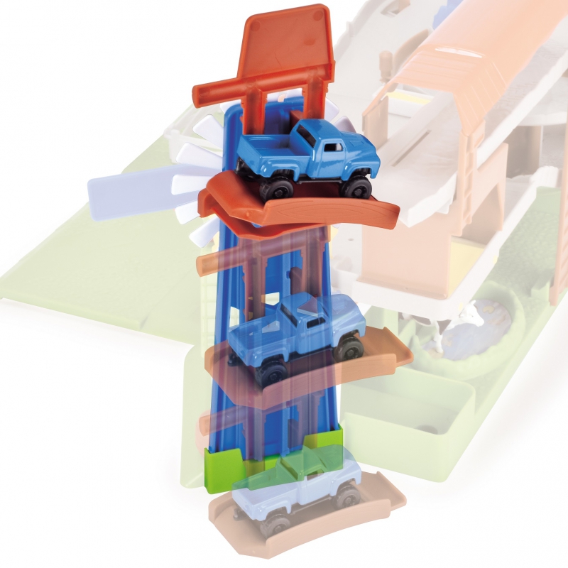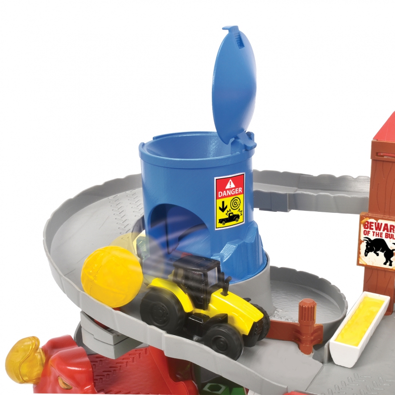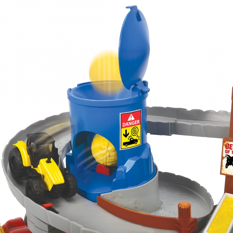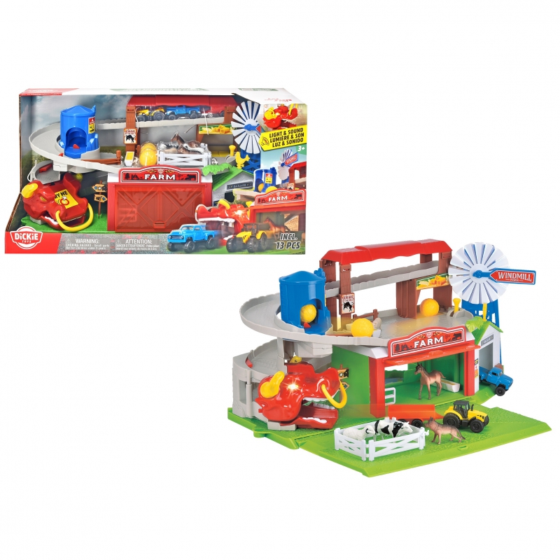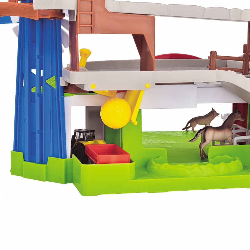 - - Rinkinį sudaro: 2 metalinės transporto priemonės (traktorius ir pikapas su priekaba), 5 gyvūnų figūrėlės (karvė, arklys, avinas, kiaulė ir šuo) ir 3 ryšuliai. šieno