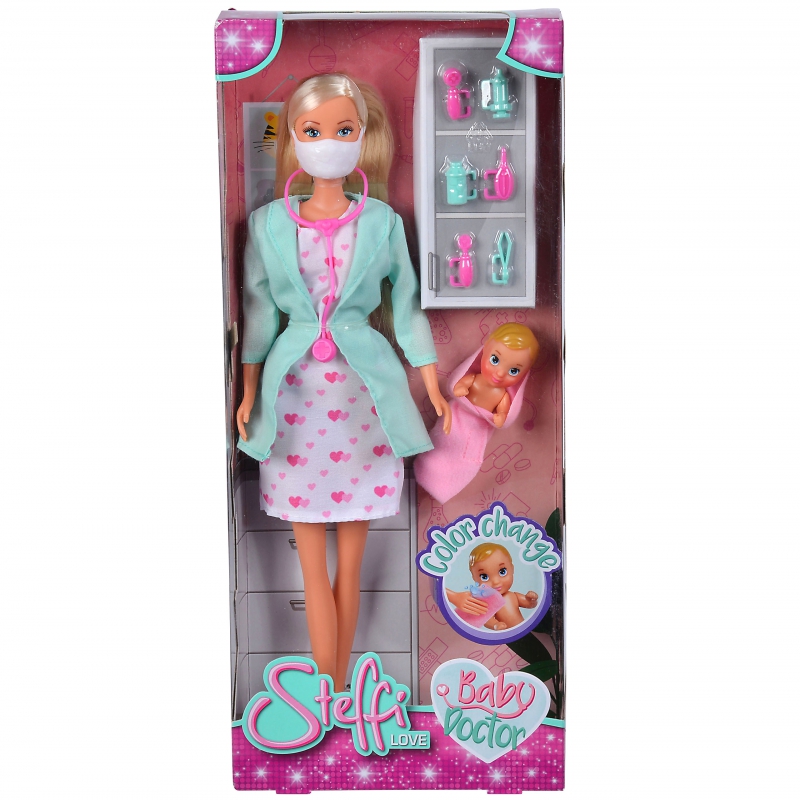 Steffi kaippediatrė, apsaugota kauke, apsirengusi skoninga prijuoste su stetoskopu ant kaklo, rūpinasi karščiuojančiu kūdikiu. Kūdikio veido paraudimas, atsiradęs dėl pakilusios temperatūros, išnyksta po trynimo su pridedama šiltame vandenyje suvilgyta šluoste – reaguoja į temperatūros pokyčius, pridedami priedai priežiūrai ir žaidimams.