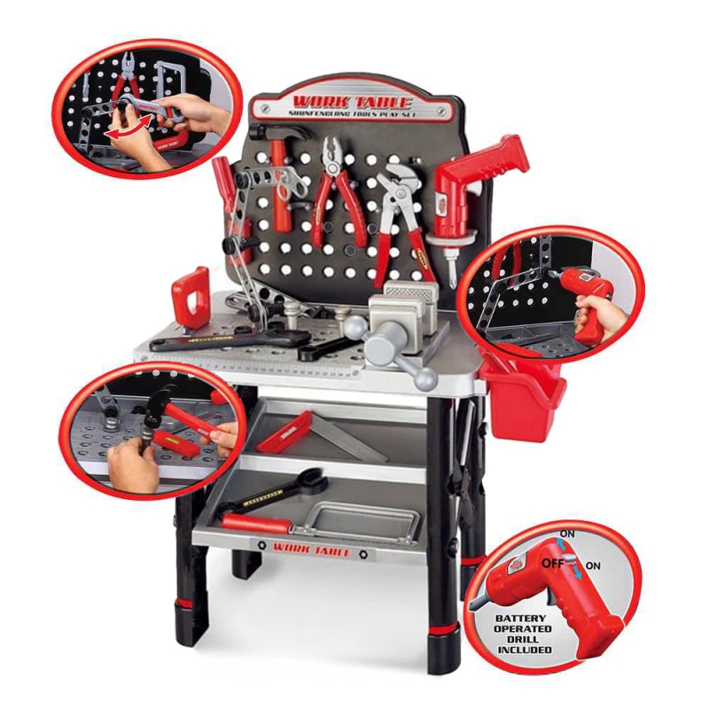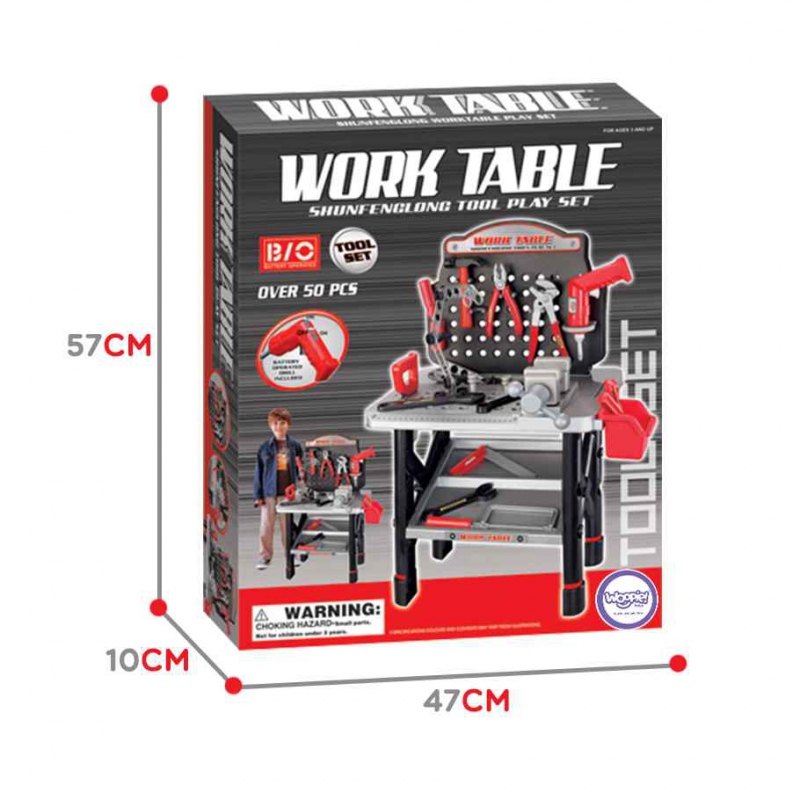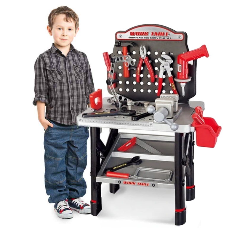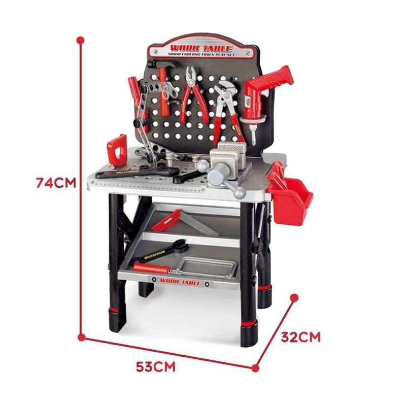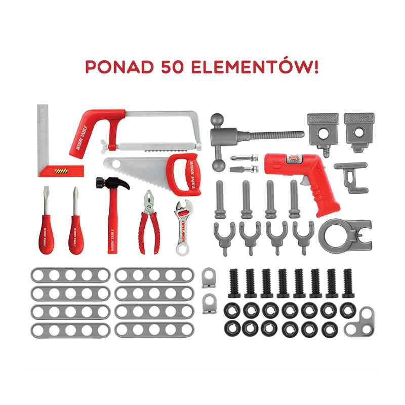 Pradžiai įrengtas WOOPIE dirbtuvių stalas puikiai tinka kiekvienam mažajam mechanikui! Tai leidžia nuo mažens išmokti naudotis statybiniais įrankiais ir jų veikimo principais. Seminaras suteiks jūsų vaikui puikų malonumą mokant savarankiškumo ir tvarkos. Tvirtas darbas ir vaikams saugios medžiagos. Žaislas lavina kūrybiškumą ir skatina mažylio vaizduotę bei formuoja jo motorinius įgūdžius. Į komplektą įeina įrankiai, reikalingi kiekvienam mažajam „pasidaryk pats“ entuziastui – baterinis grąžtas, plaktukas, pjūklas, veržlė, atsuktuvas, varžtai ir kiti elementai. Rinkinį sudaro net 50 elementų!